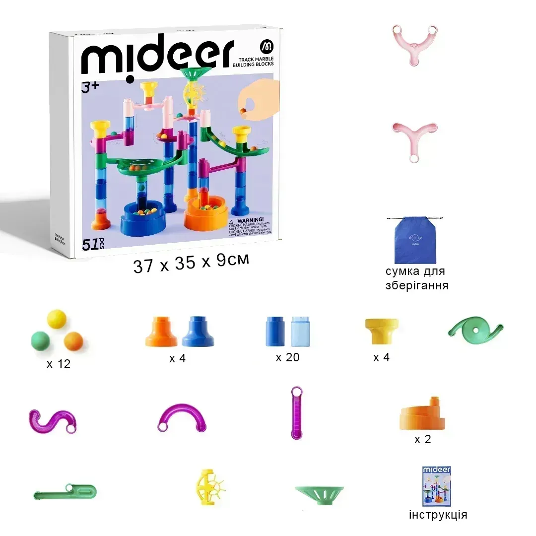 Конструктор Mideer Marble track створений для розвитку творчості, покращення когнітивних навичок та ознайомлення з основними поняттями фізики.