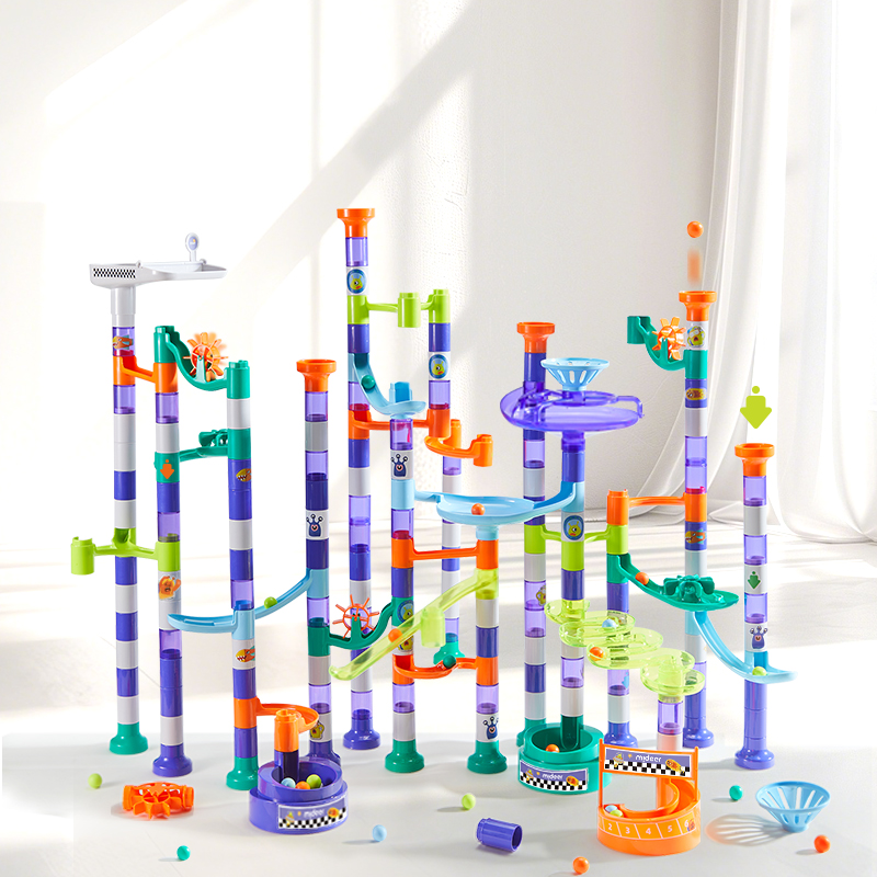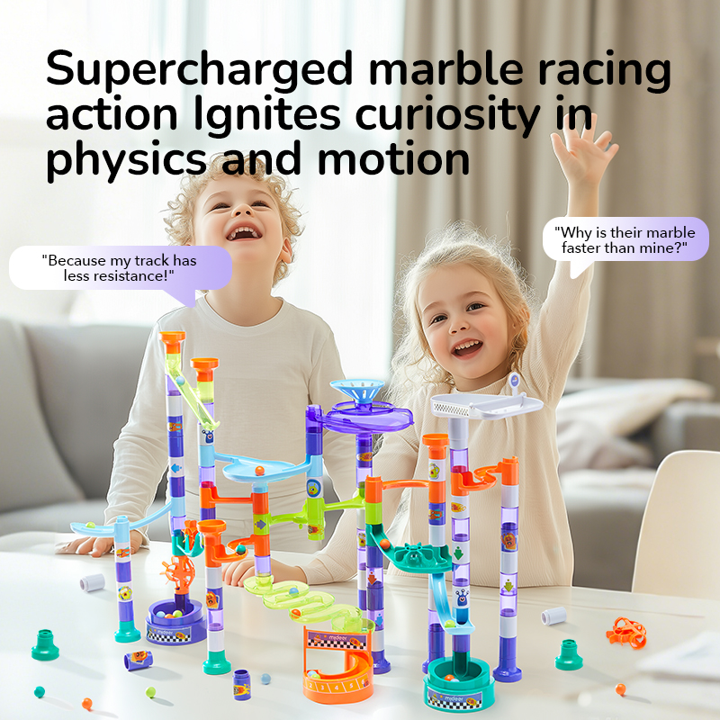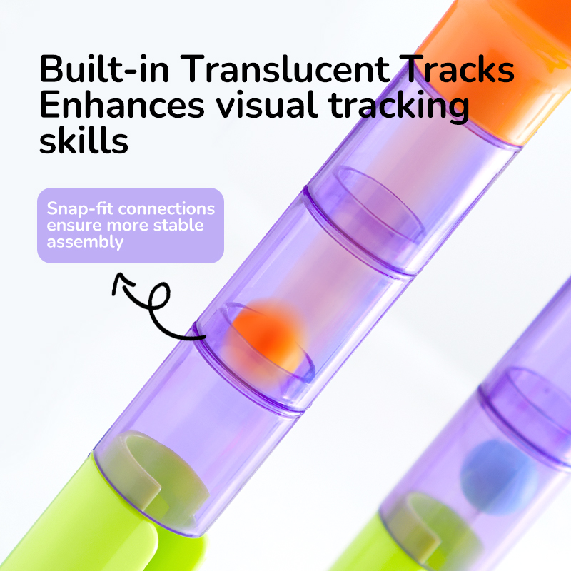 Прозорі деталі треку: Спостерігайте, як мармурові кульки пролітають крізь прозорі деталі, щоб отримати додатковий азарт та візуальну привабливість під час розгортання дії.