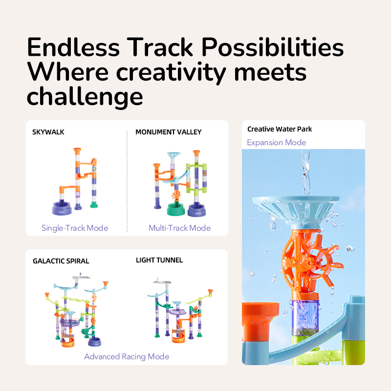 Розроблений з унікальними формами трас, такими як L-подібні спуски, стрибки та обертові диски, цей набір забезпечує непередбачувану, швидкісну мармурову веселу гру. Виготовлений з гладких, безпечних матеріалів, усі деталі зручні для дітей та довговічні.