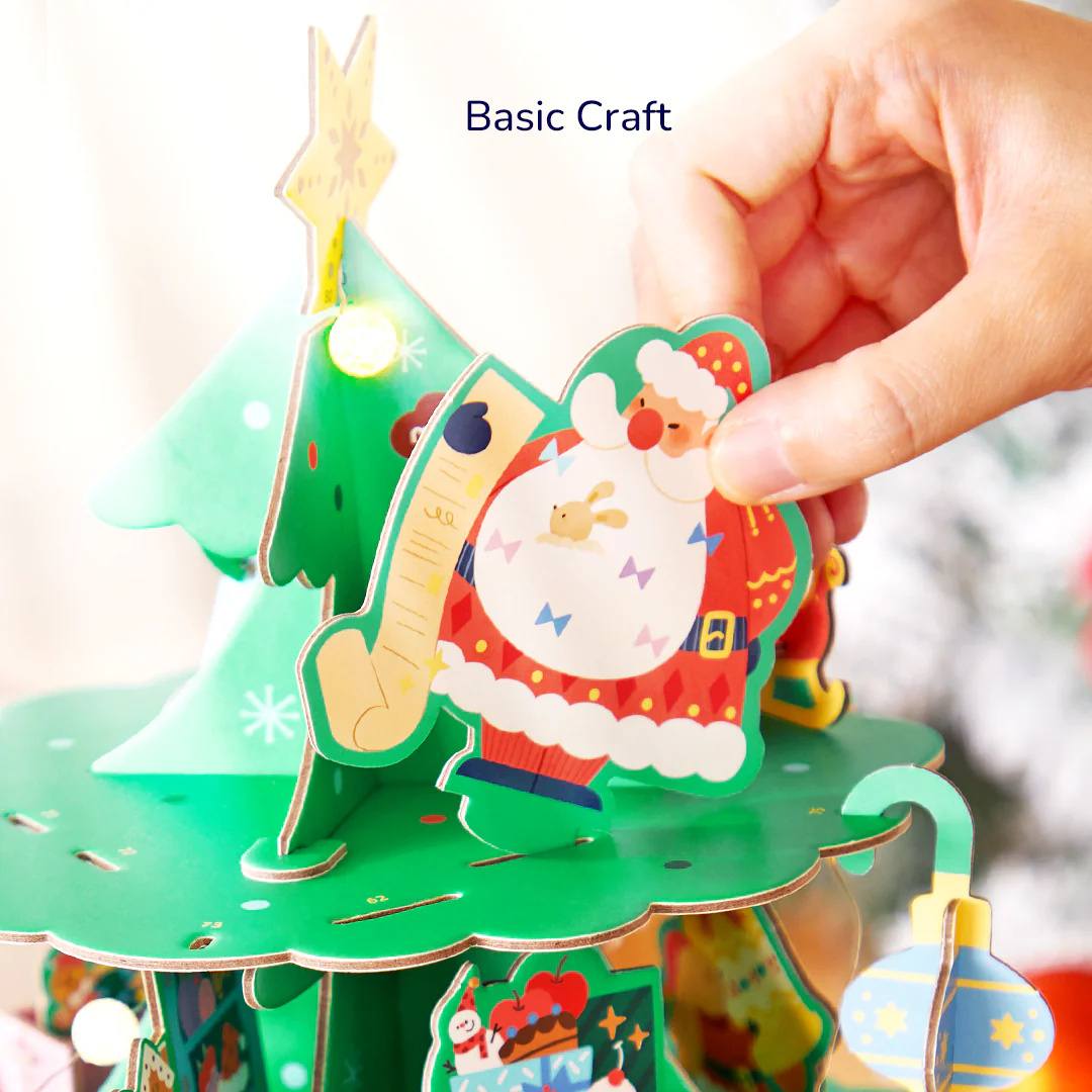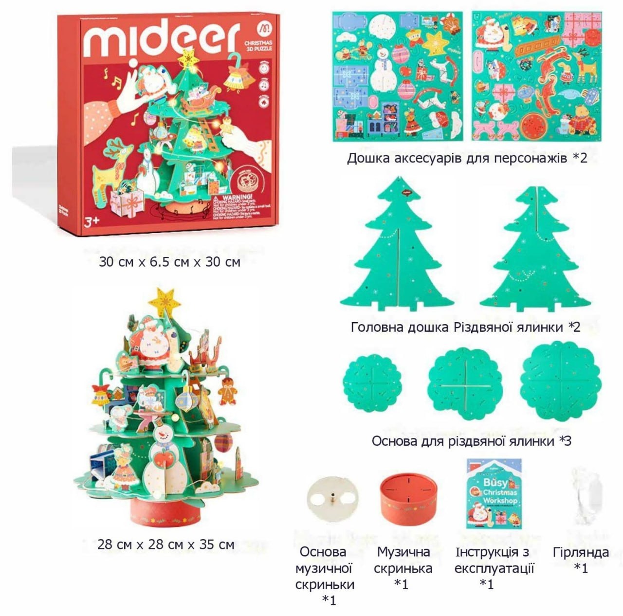 У комплекті: 2 основні дошки для ялинки, 3 основи для ялинки, 2 дошки для аксесуарів з персонажами, 1 основа для музичної скриньки, 1 музична скринька, 1 інструкція з експлуатації, 1 світлова гірлянда