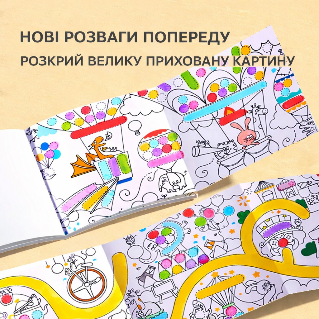 Містить 30 сторінок - 19 сторінок творчих зображень для малювання точковими маркерами, 10 сторінок для вільного мистецтва та 2 пов’язані сторінки з великими сценами для втілення ваших творчих ідей!