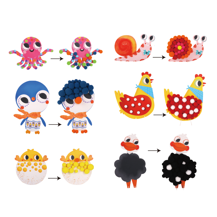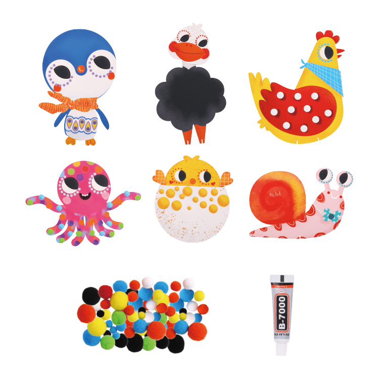 Необхідно прикрасити тварин, використовуючи м'які помпони. Картина виходить об'ємною та дуже красивою.